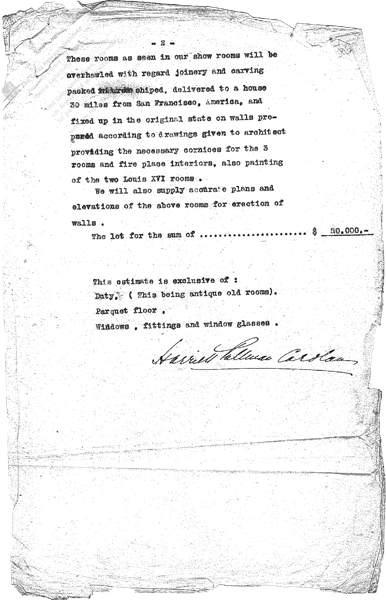 The circular Large Salon was considered the Drawing Room of the house. The more elaborately carved Small Salon was an ideal space for a private conversation. The intricate original ceiling roundel of the Large Salon has at its center the face of Apollo the Sun God, an important decorative element in classic French design. When Harriett removed her furnishings from Carolands in the late 1920s, she had the panels, mirrored doors and mantles carefully taken out of the Château and stored locally. After Harriett’s death in 1956, Countess Dandini purchased them from Harriett’s estate and had them reassembled piece by piece within the exposed brick walls. This 30-year absence of the panelling added to the rumors that the house had not been completed.